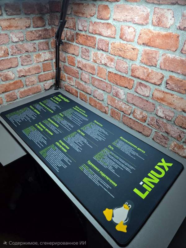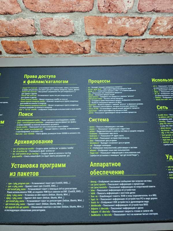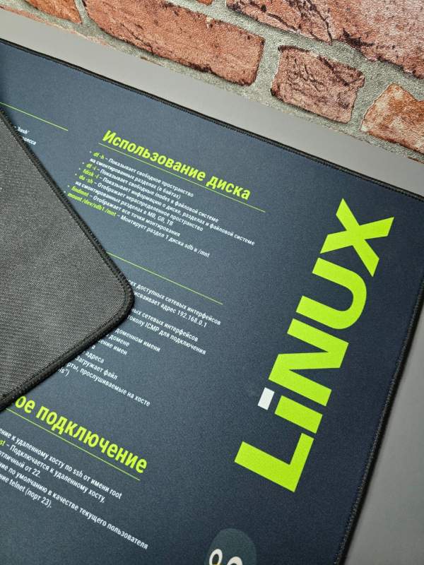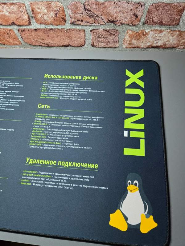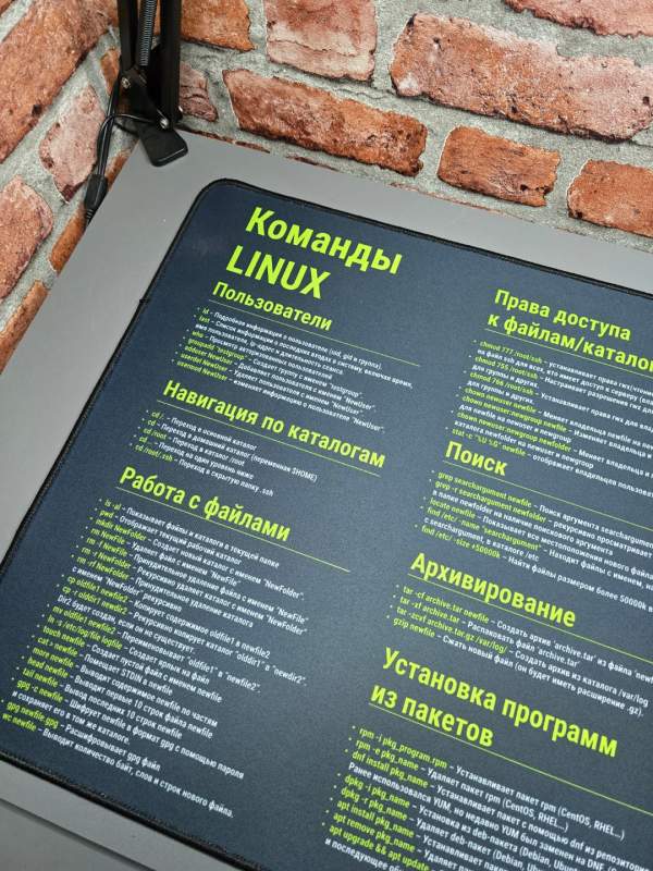 На поверхности коврика размещены основные и часто используемые команды Linux с русскими пояснениями, что делает его не только элементом дизайна, но и полезной шпаргалкой для работы и обучения. Идеально подходит для дома, офиса, учебы и подарка IT-специалисту.