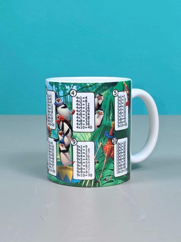 Керамическая кружка с таблицей умножения и героями мультфильма «Мадагаскар» — это не просто яркая и практичная посуда для чая, какао или молока, а еще и удобный инструмент для обучения детей. Благодаря красочному дизайну и веселым персонажам, ребенок быстрее запоминает таблицу умножения, а утренний завтрак превращается в увлекательное занятие.