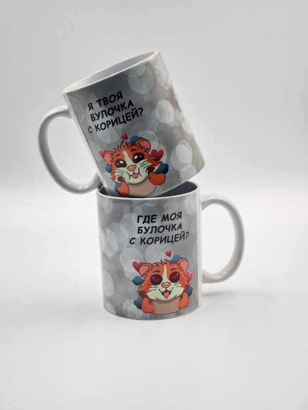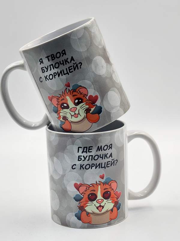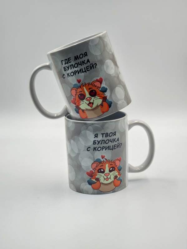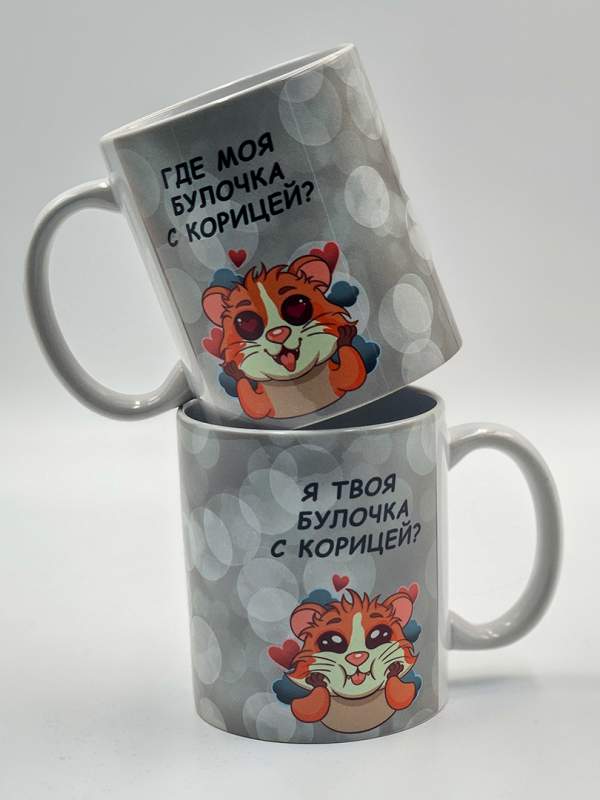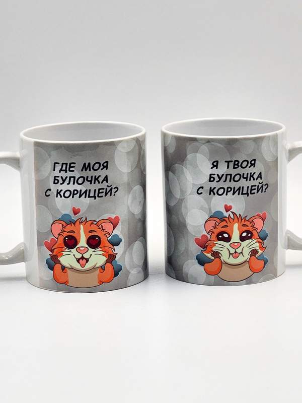 Парные кружки для влюблённых с милыми хомяками и надписями «Где моя булочка с корицей?» и «Я твоя булочка с корицей» — это оригинальный подарок, который подчеркнёт близость и тёплые отношения между двумя людьми. Каждая кружка выполнена из качественной керамики и имеет яркий, стойкий принт, который не теряет насыщенности даже после множества циклов мытья.